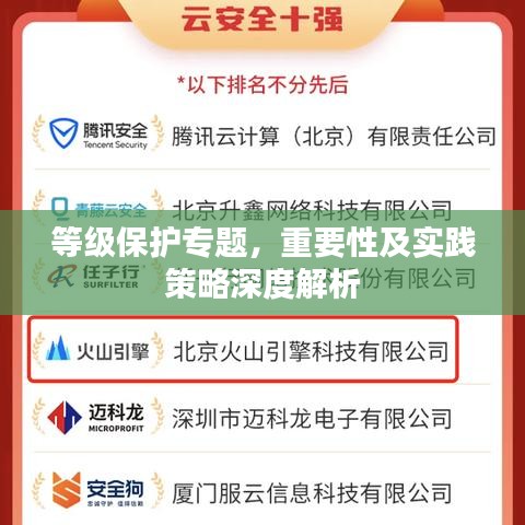 随着信息技术的快速发展,网络安全问题日益凸显,等级保护专题逐渐成为公众关注的焦点,等级保护,简而言之,就是针对不同等级的信息系统实施不同程度的保护措施,确保信息系统安全稳定运行,保障数据安全,本文将围绕等级保护专题展开讨论,帮助读者理解其重要性及实践策略。