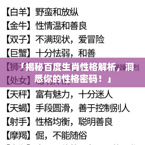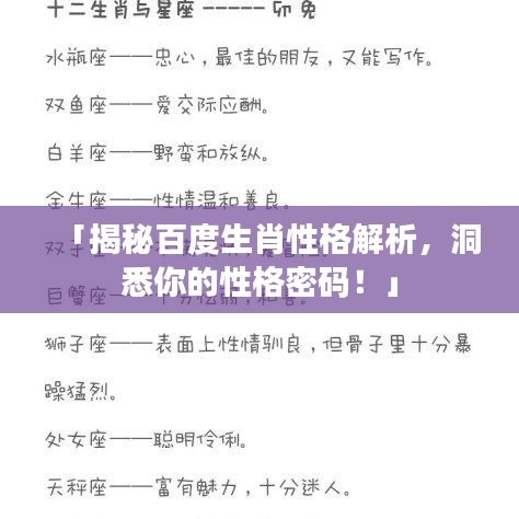 随着人们对传统文化的热爱逐渐加深,越来越多的人开始关注自己的属相性格特征,在中国传统文化中,属相与人的性格、命运等息息相关,如何通过百度一下了解属相性格分析呢?本文将为您深入解析。